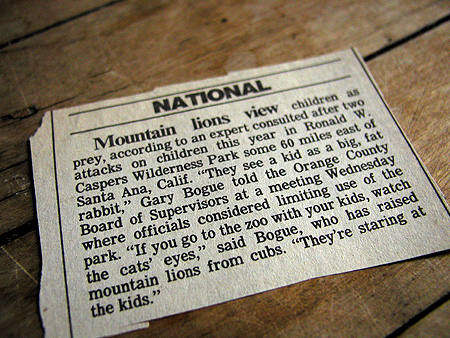 Still feeling shaky and weak, but generally better today. Well enough to consume some coffee, at any rate, and throw together an obnoxiously upbeat playlist…including the likes of The Flaming Lips, General Public, The Get Up Kids, Le Tigre, Madonna, Manitoba, Metric and Superchunk. This got me revved up enough to search for my passport. We are leaving for Iceland next month, after all. Now, I fully acknowledge that I am a pack-rat of the worst kind. I cling to items with no rhyme or reason, and when it is suggested to me that it is time for a purge, many of these things must be forcibly pried loose from my kung fu death grippe…if at all. So when rooting around the nooks and crannies of my bedroom today, attempting to locate said passport, I came across all sorts of other crap. From the mundane, like ancient Aveda lipsticks, expired condoms, and an unused stick of deodorant (which I promptly threw out, honest). To the more interesting, like letters from my good friend Monica, written when she was in the peace corps in Morocco. And a cheesy little notebook I bought the last time I was in Iceland. And adorable little handbags handed down to me by my grandmother. And the truly odd, from my dear old pack-rat of a Dad. Long before I knew of News of the Weird there he was, scanning the newspapers daily and clipping out whatever articles struck his fancy. These he would save up in little yellow envelopes, and, when one was full, he would entrust it to me. Today I came across one such packet…from the mid-1980s. Many of the articles are just plain depressing. Some are interesting, in that he was following a thread about the ozone layer (circa 1986) and another about the Tamil Tigers in Sri Lanka, while others are just plain quirky. Those are my favorites, of course. A full photoset can be found here.